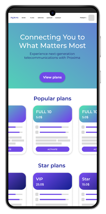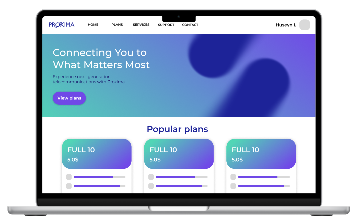 This website design for Proxima, a modern internet service provider, features a clean and vibrant interface with a blue-to-purple gradient theme that conveys innovation and reliability.