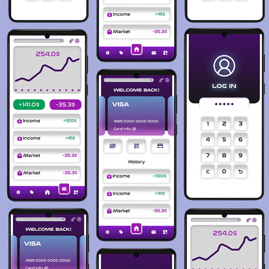 This mobile banking app UI is designed with a clean, modular layout and a consistent purple gradient color scheme to enhance visual hierarchy and brand identity.