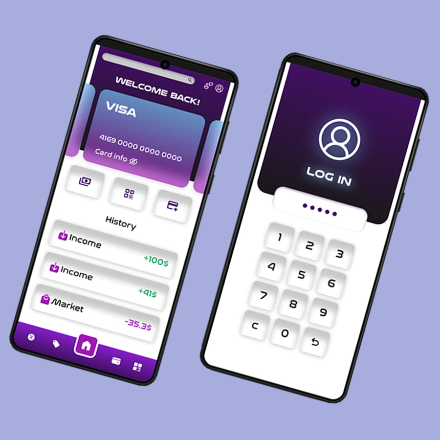 The interface includes multiple key components: a secure PIN-based login screen with a custom numeric keypad, a dynamic line chart for balance tracking, and a transactional overview
